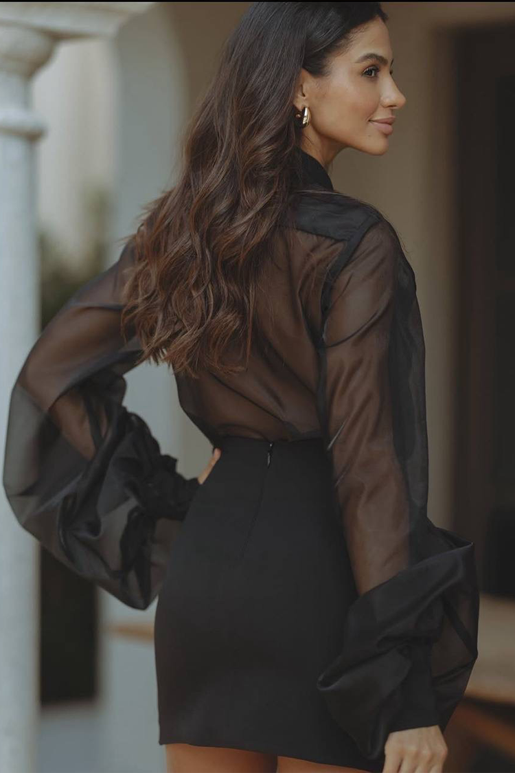 - Bluza are mâneci lungi și bufante, guler și material transparent, iar fusta este scurtă și are o croială sexy, mulată.