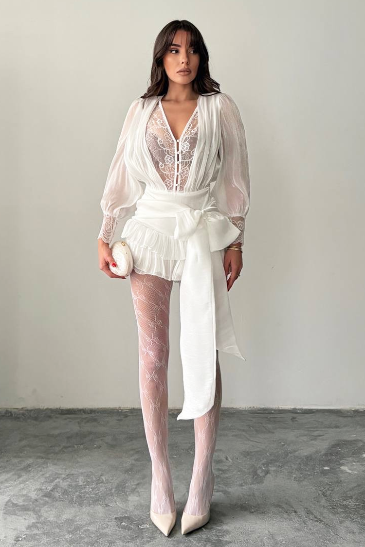 - Modelul are un decolteu decupat, dantelă, volane în partea de jos și o panglică spectaculoasă.