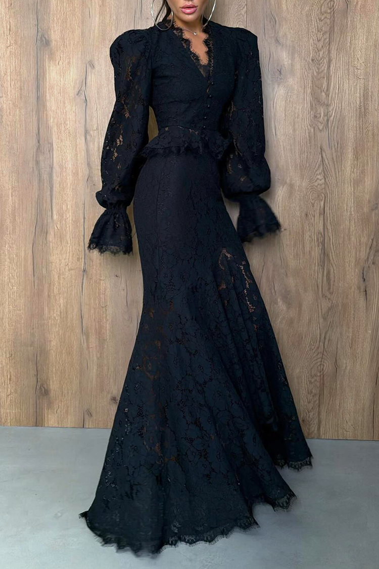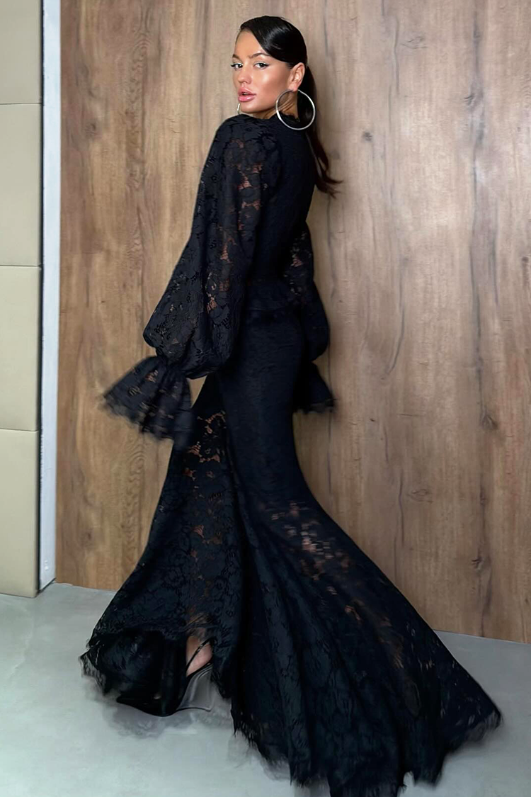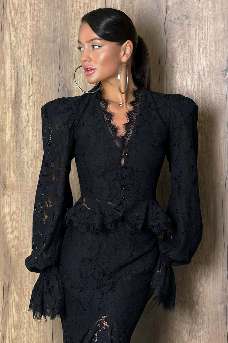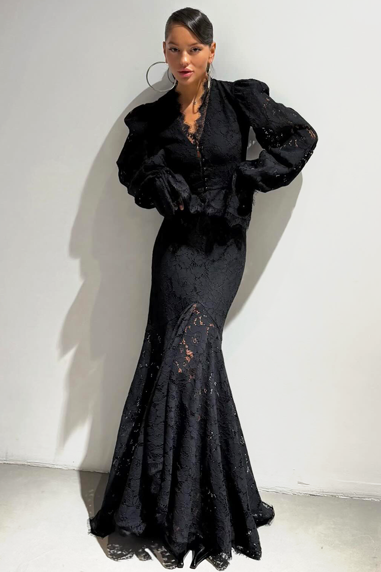 - Cămașa are mâneci lungi și spectaculoase și nasturi eleganți la decolteu. Fusta are talie înaltă și lungime lungă.