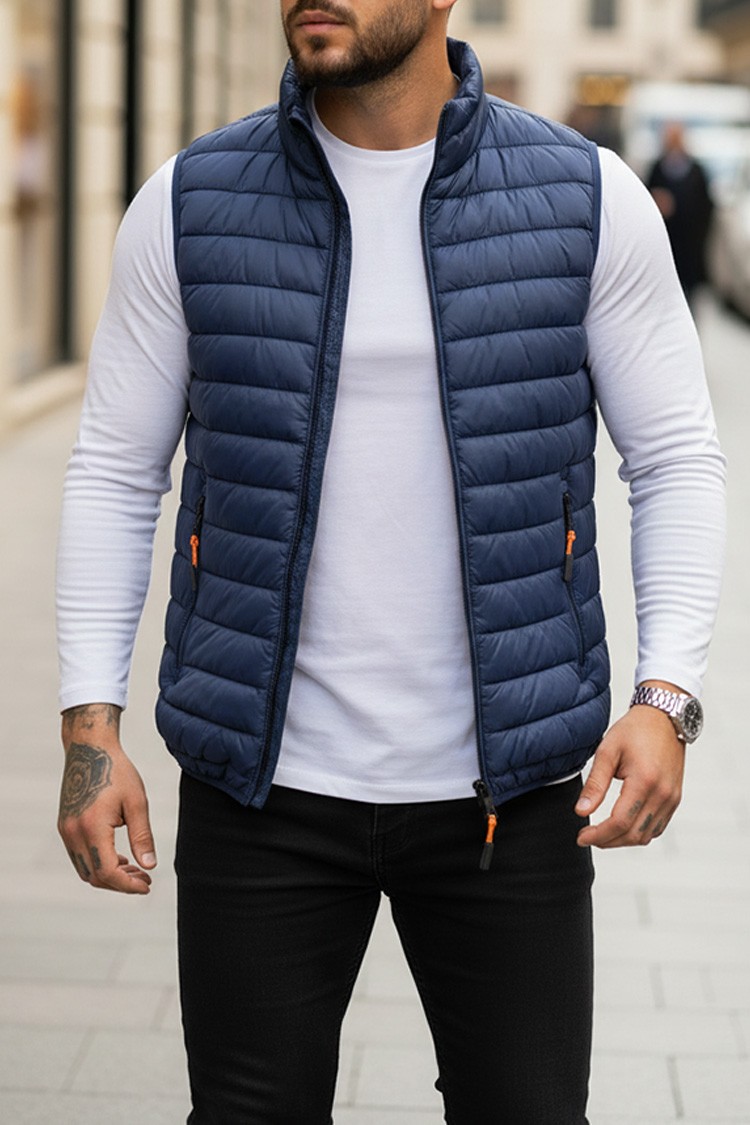 - O vestă pentru bărbăti in stil sport-casual, cu o structură matlasată și un guler înalt, de culoare albastru închis.