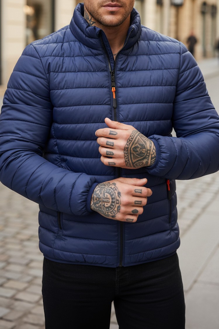 - Geacă matlasată pentru bărbăti cu un design simplu, de culoare albastru închis, potrivită pentru anotimpurile de tranziție.