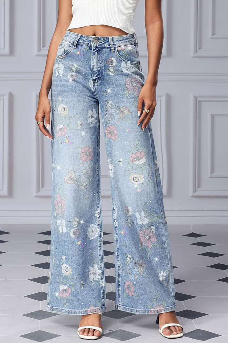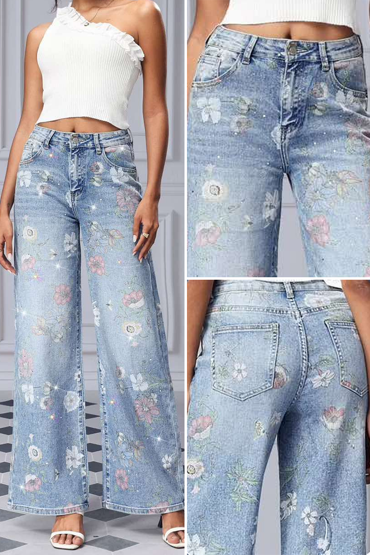 - Modelul are talie înaltă, si picioare late, detalii strălucitoare și imprimeu floral.