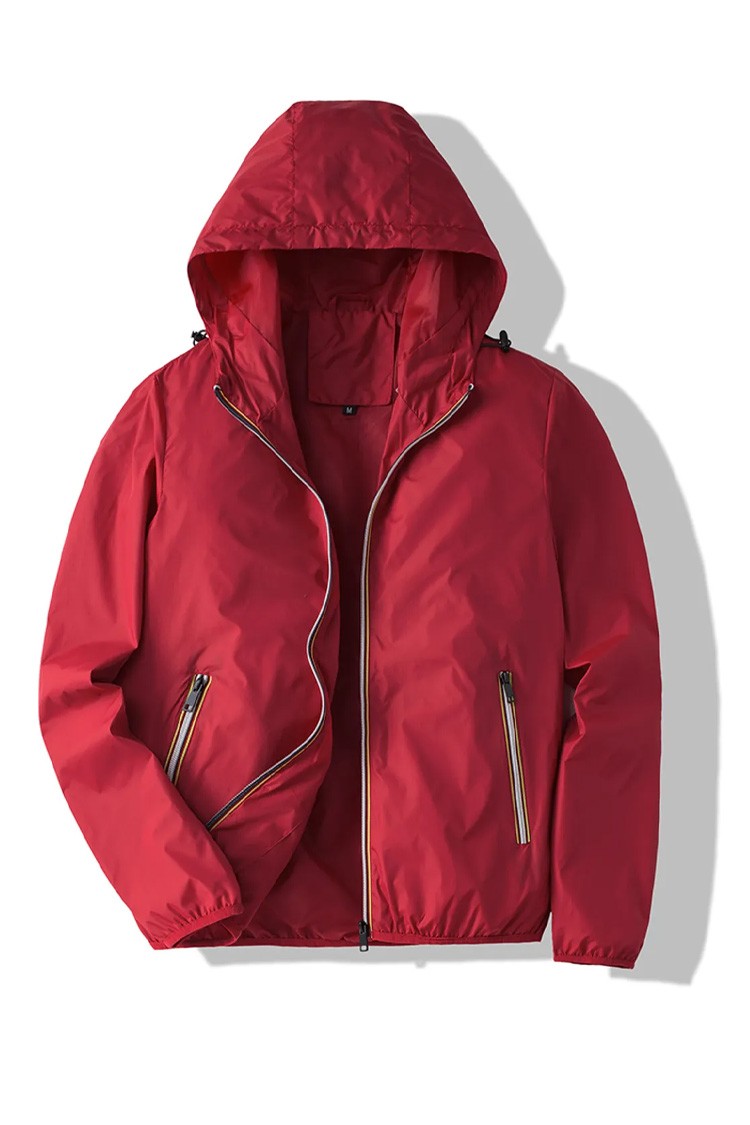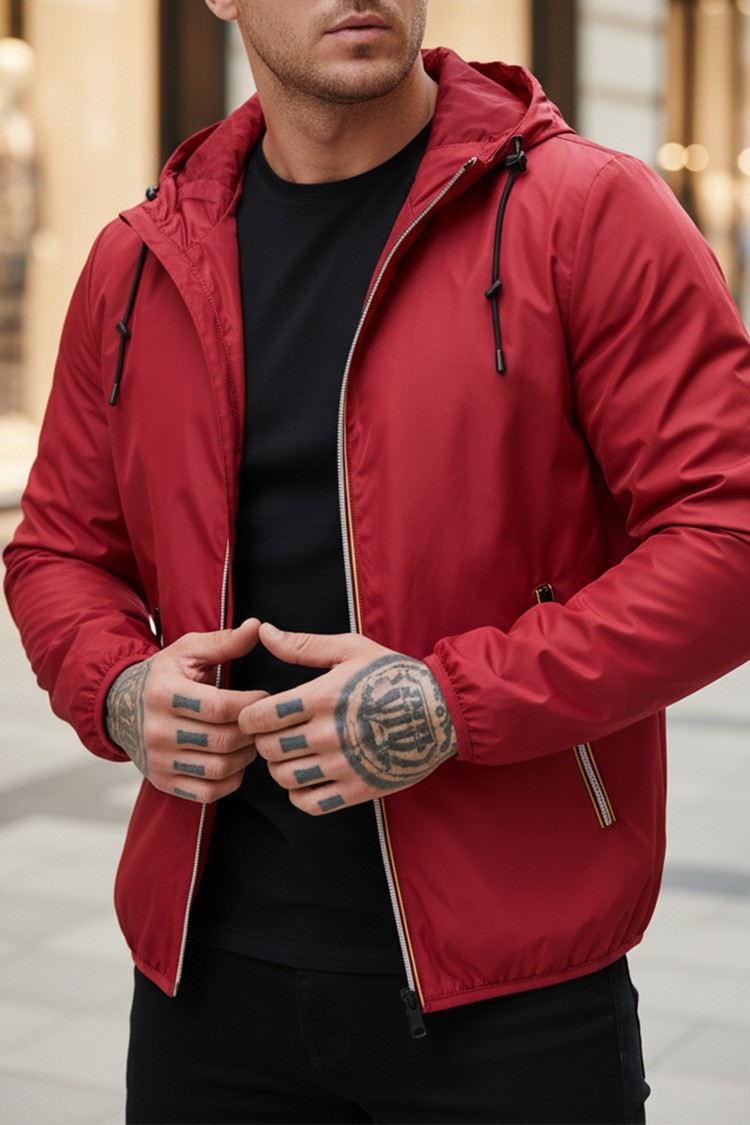 - Geacă pentru bărbăti model basic, de culoare roșie, cu un stil sport de zi cu zi, potrivită pentru anotimpurile de tranziție.