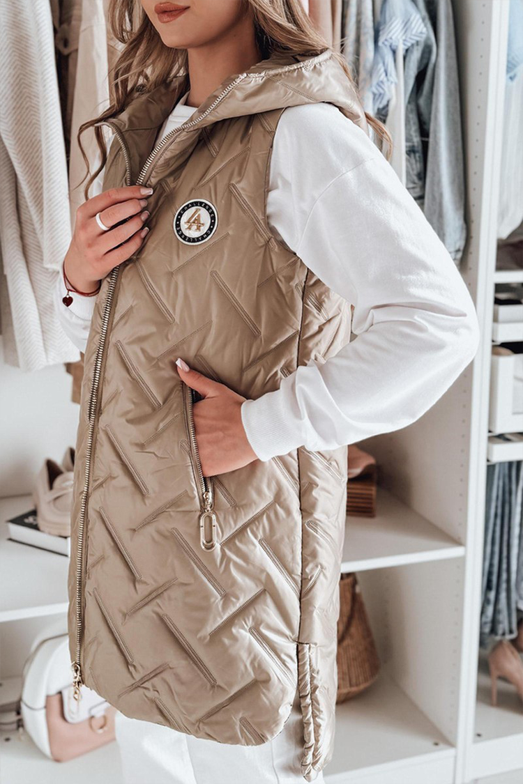 - Vesta are o croială clasică, guler, buzunare, design matlasat și glugă.