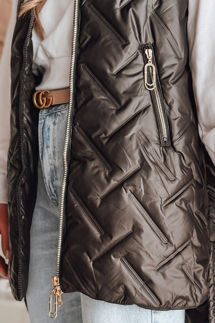- Vesta are o croială clasică, guler, buzunare, design matlasat și glugă.