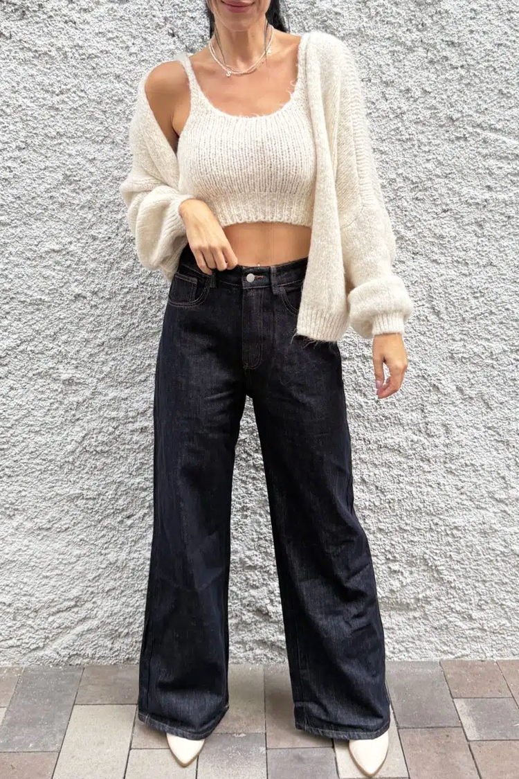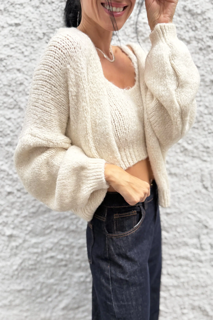 - Topul are un design mulat și o lungime scurtă, iar vesta are mâneci lungi și o croială clasică.