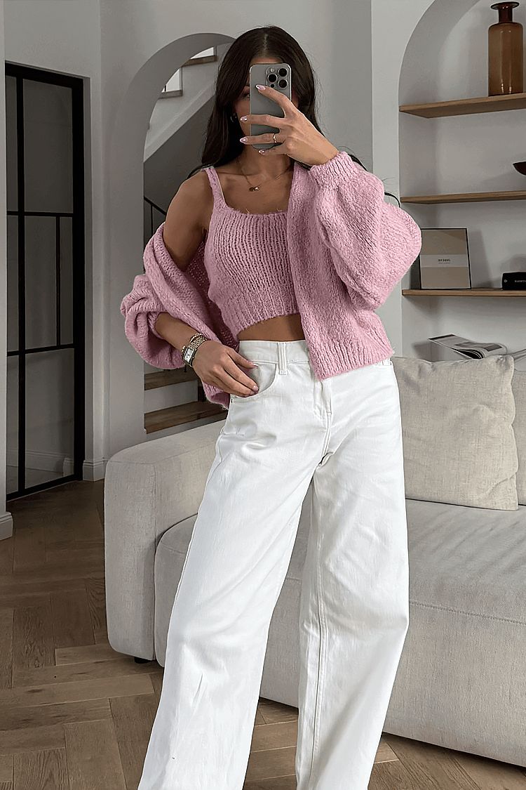 - Topul are un design mulat și o lungime scurtă, iar vesta are mâneci lungi și o croială clasică.