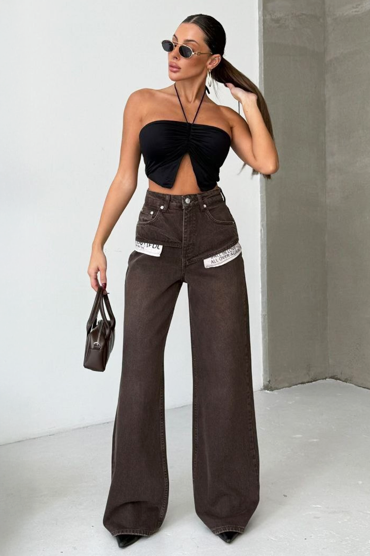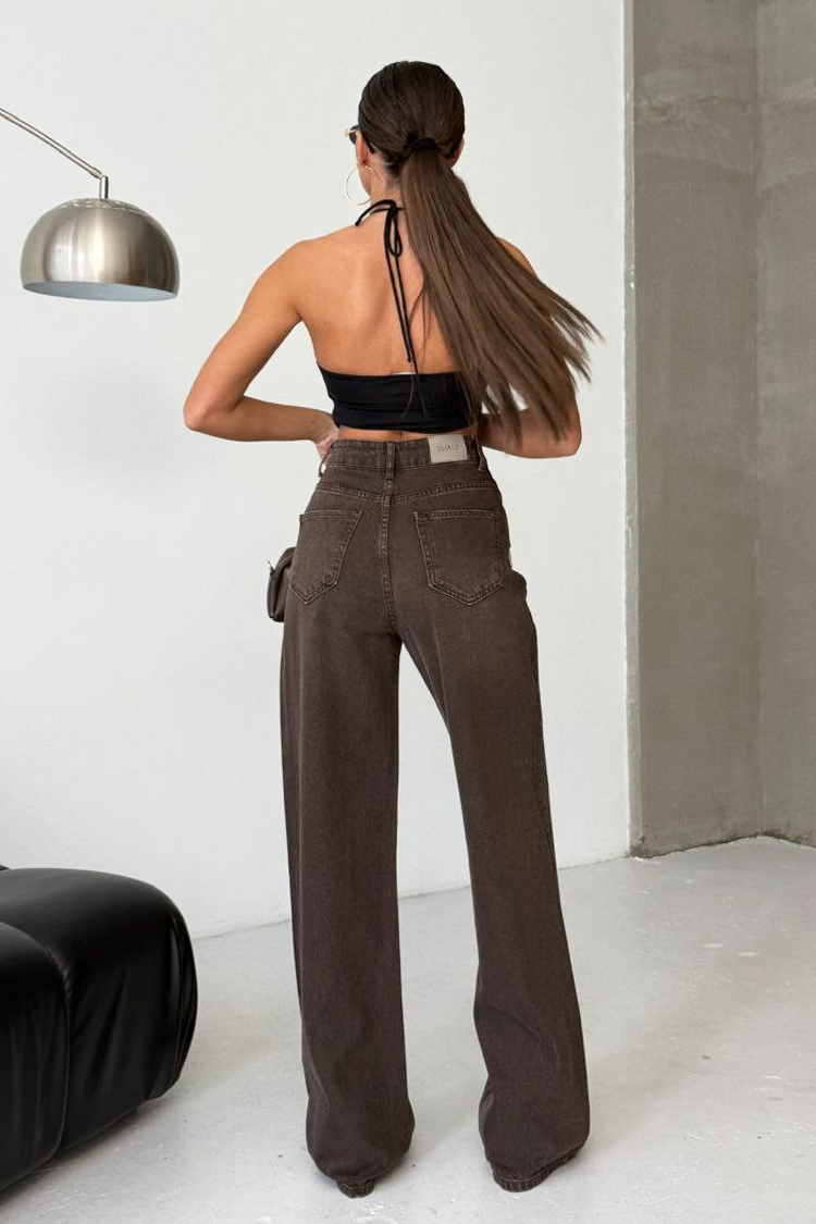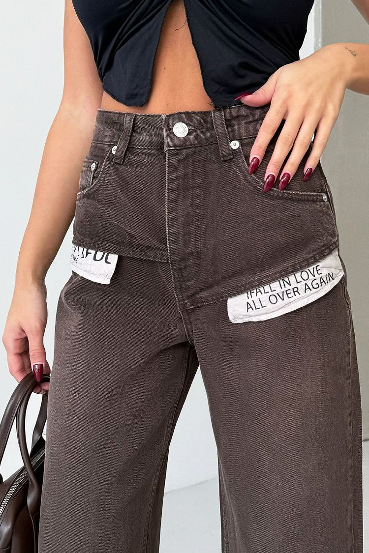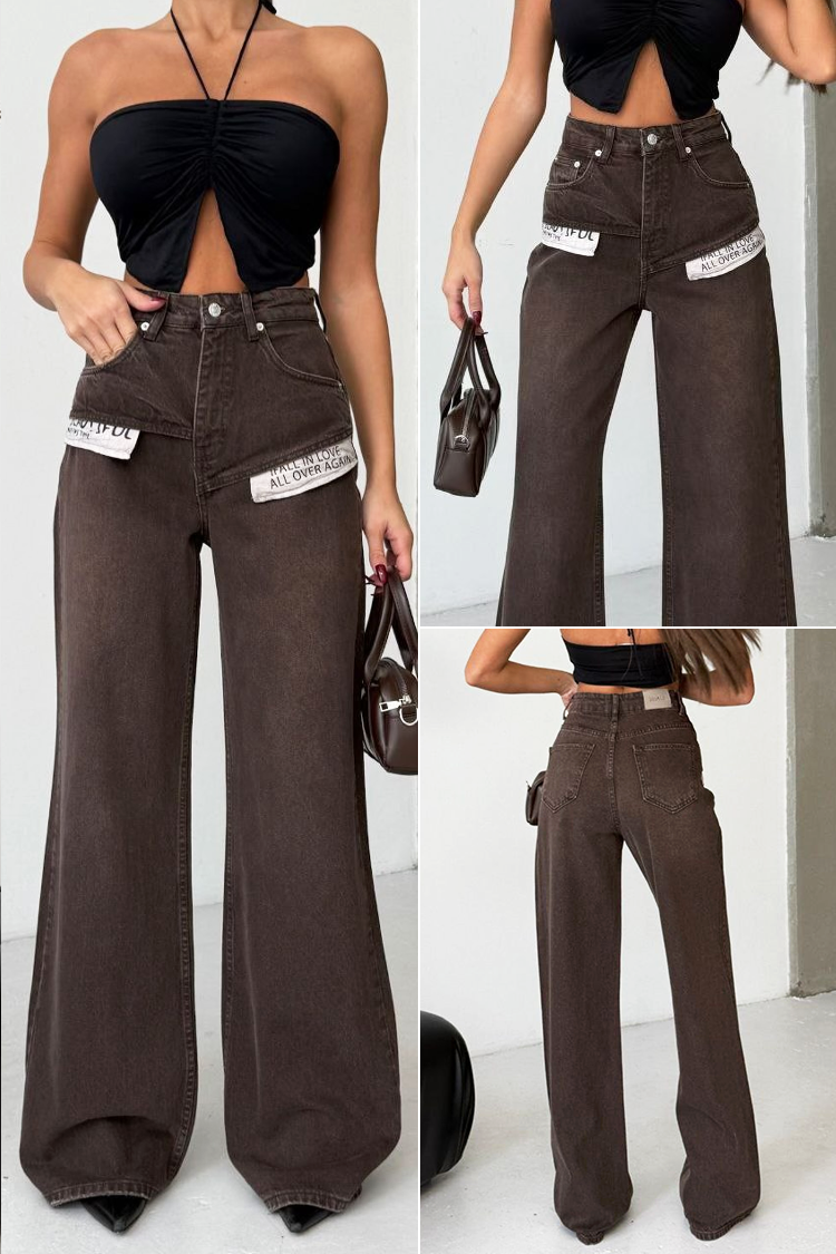 - Modelul are talie înaltă, buzunare, o croială lejeră, detalii atrăgătoare și un model de culoare maro.