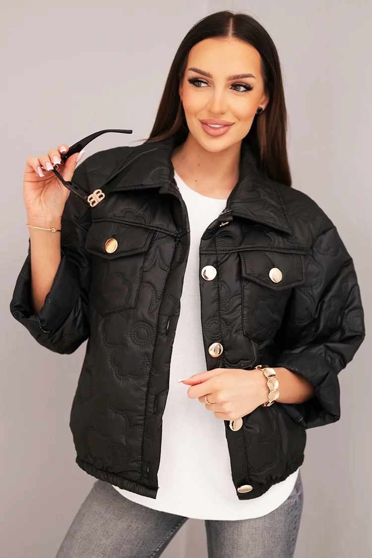 - Modelul are o lungime scurtă și un design matlasat, buzunare și se închide cu nasturi în față.