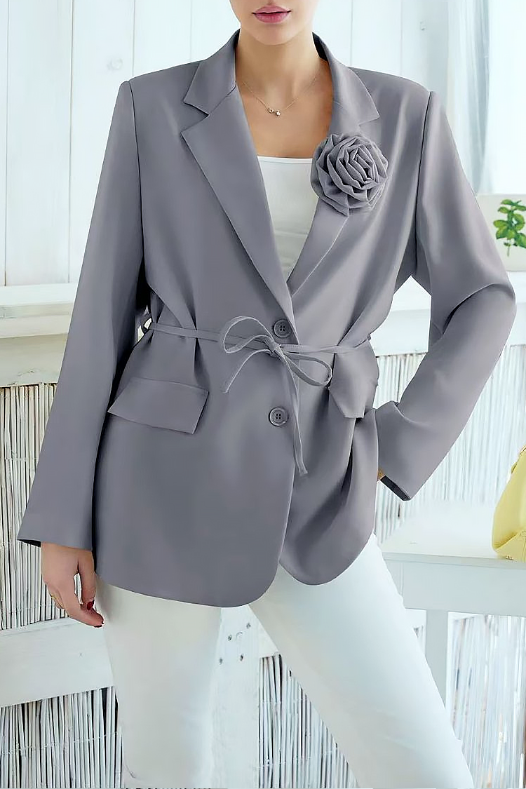 - Modelul are o croială elegantă, guler clasic, curea din același material și trandafir decorativ.
