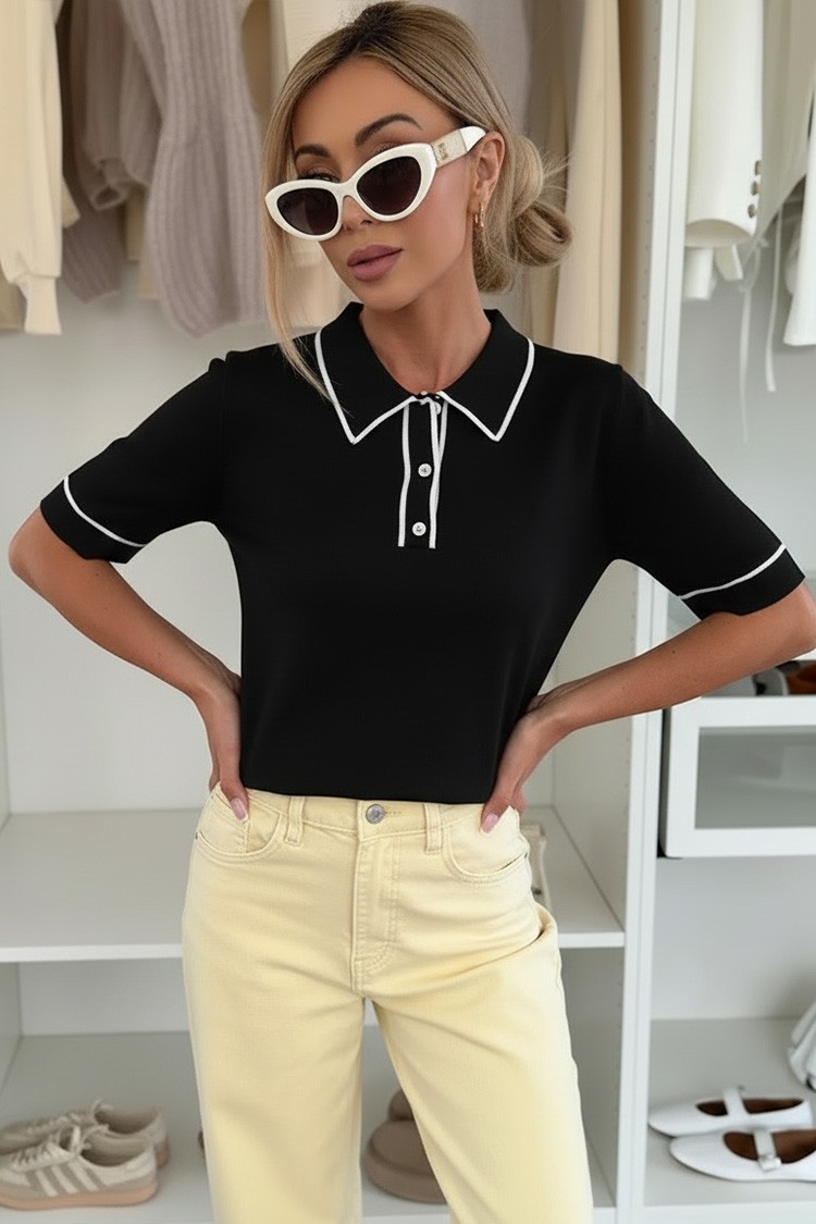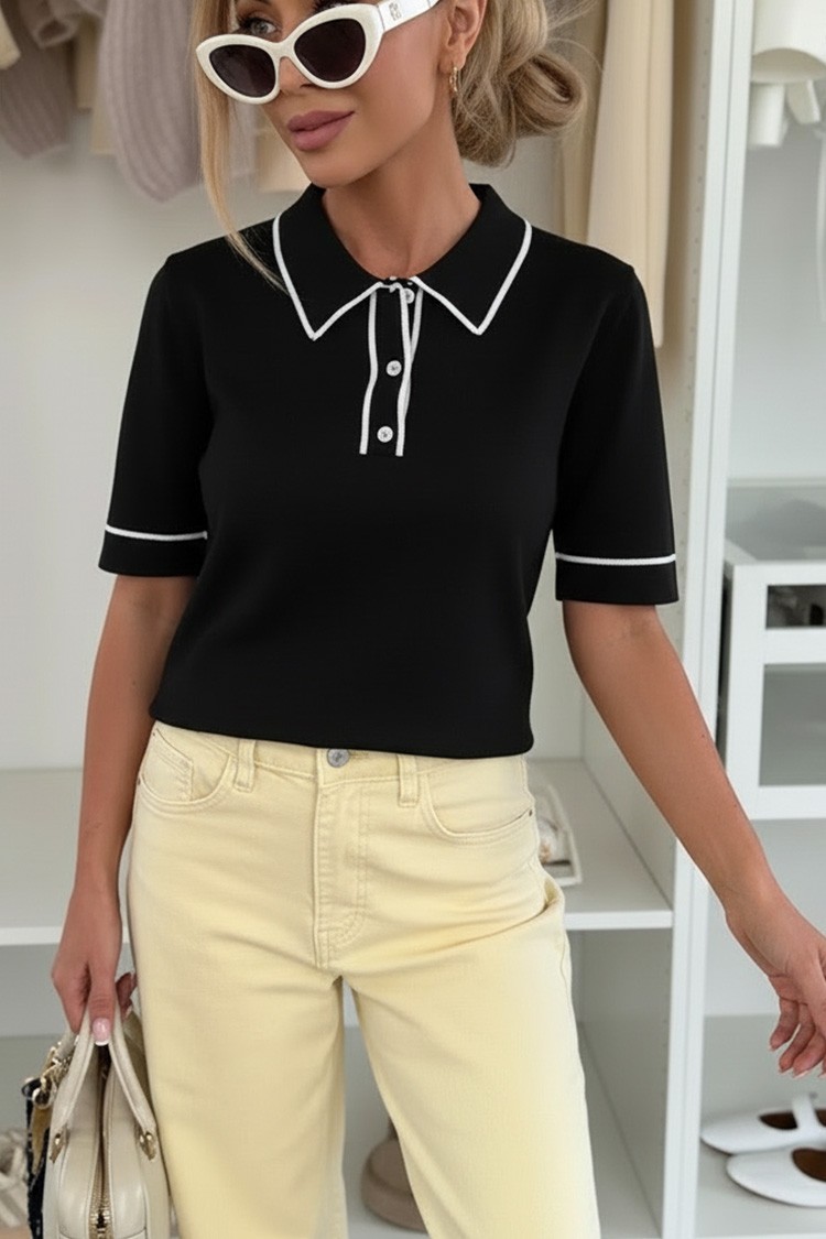 - Modelul are mâneci scurte, un guler atractiv, nasturi și detalii albe.