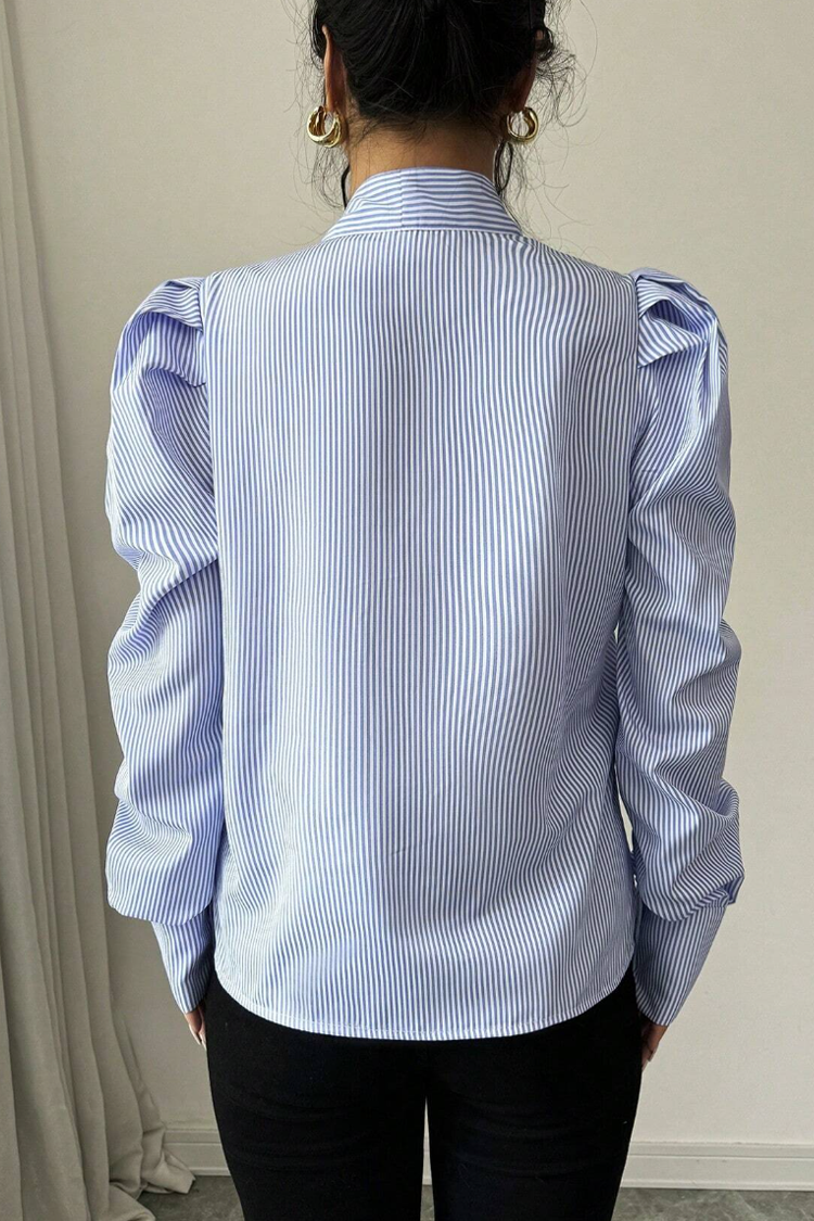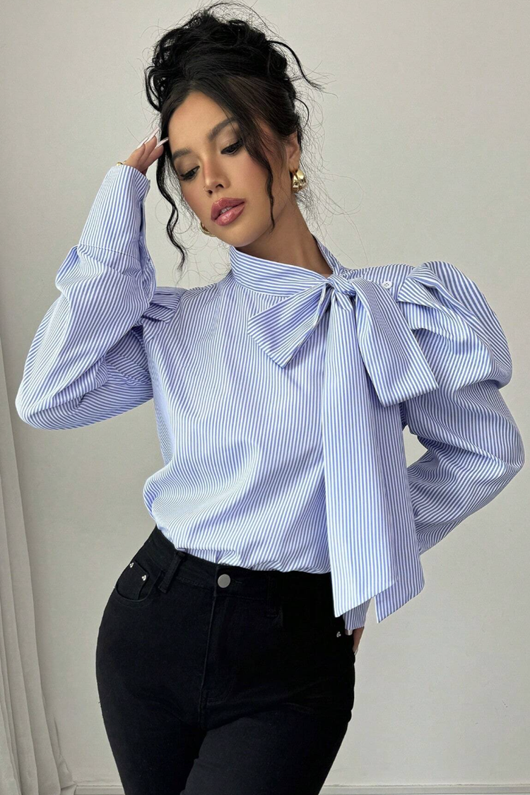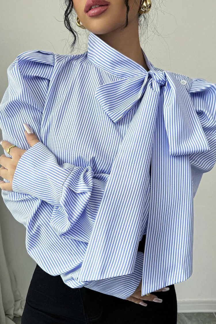 - Modelul are mâneci lungi, un design atractiv, o panglică și un model în dungi.