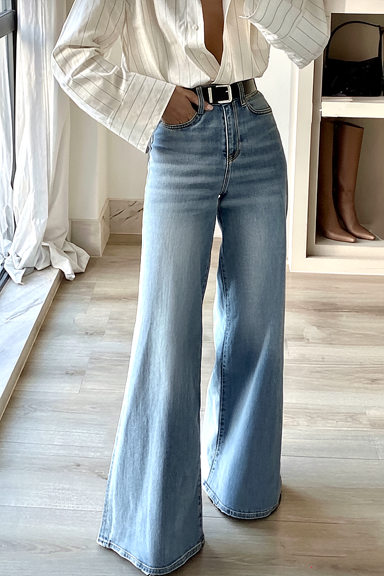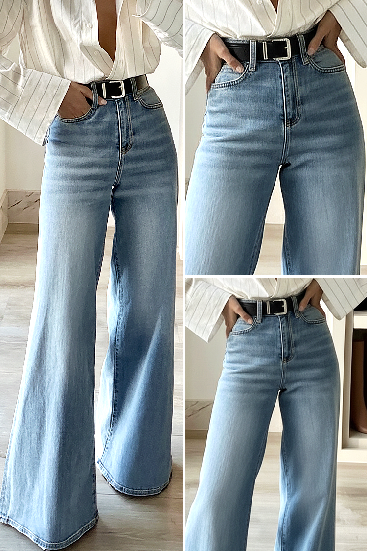 - Modelul are talie înaltă, picioare late și o parte laterală dreaptă albastru deschis.