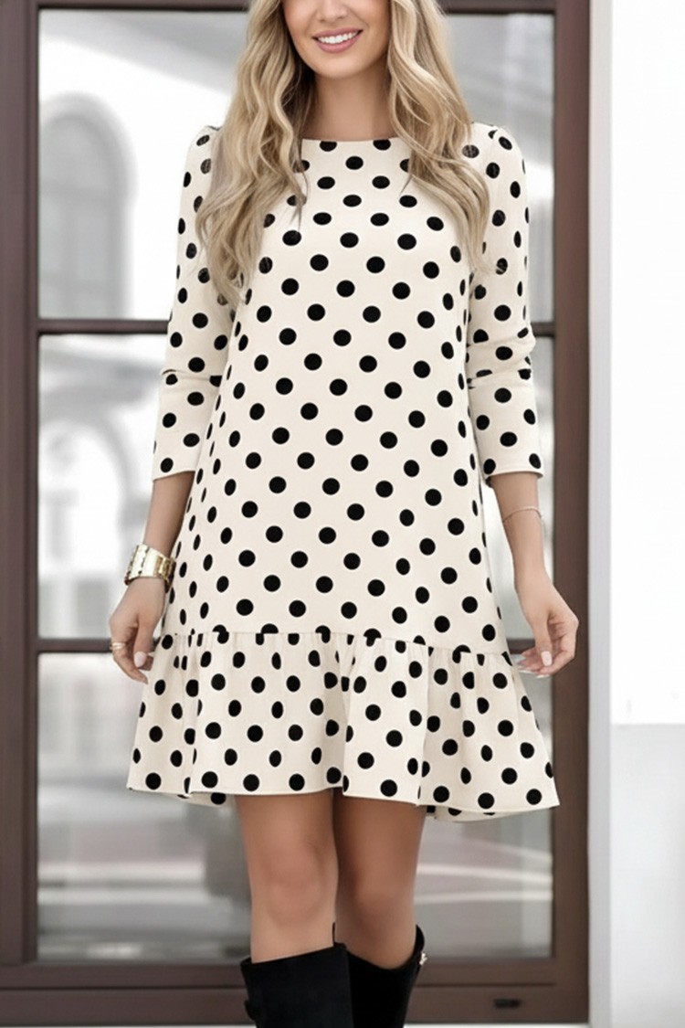 - Rochia are mâneci 3/4, o croială lejeră, lungime scurtă și un model cu buline.