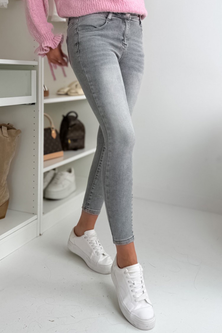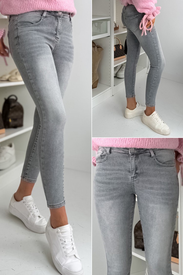 - Modelul are talie înaltă, buzunare, o croială mulată și un efect decolorat modern.