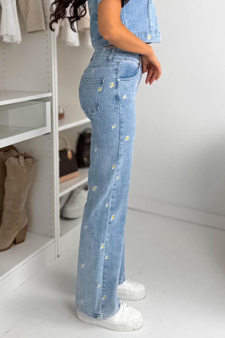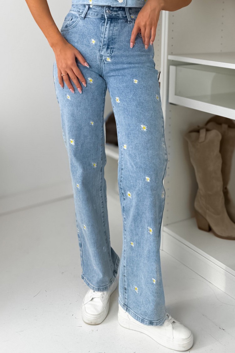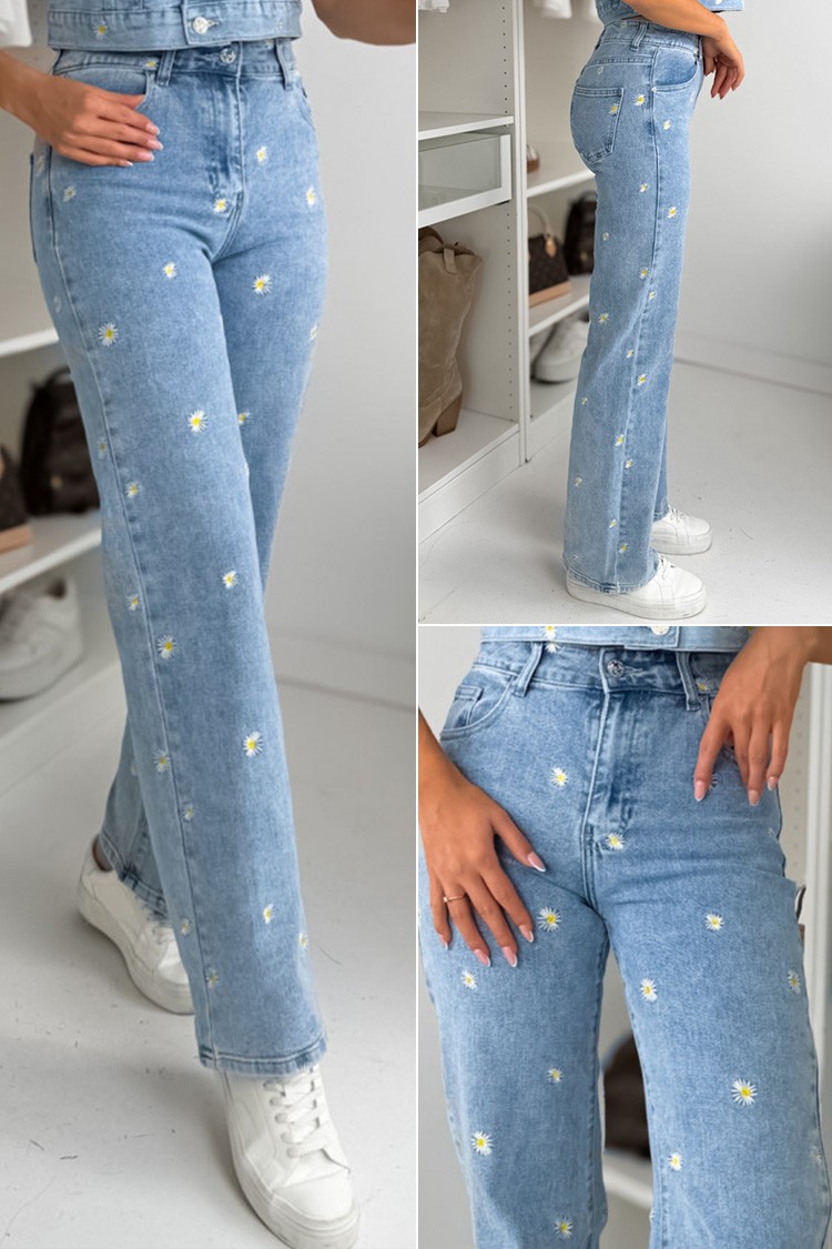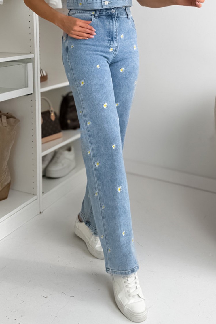 - Modelul are talie înaltă, buzunare, o croială lejeră, un efect cu rupturi modern și un model de culoare albastru deschis.