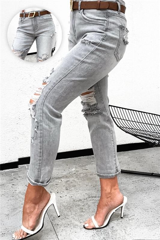 - Modelul are talie înaltă, model gri deschis și un efect modern de rupturi pe partea din față și din spate.