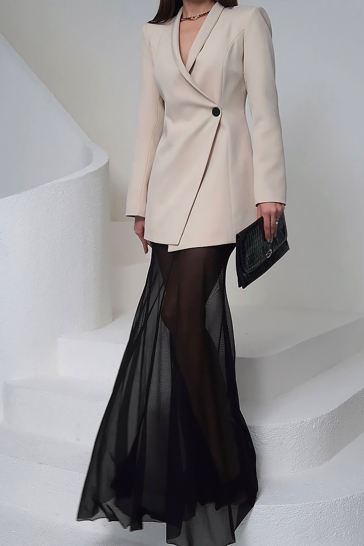 - Fusta are talie clasică, lungime lungă din țesătură transparentă.