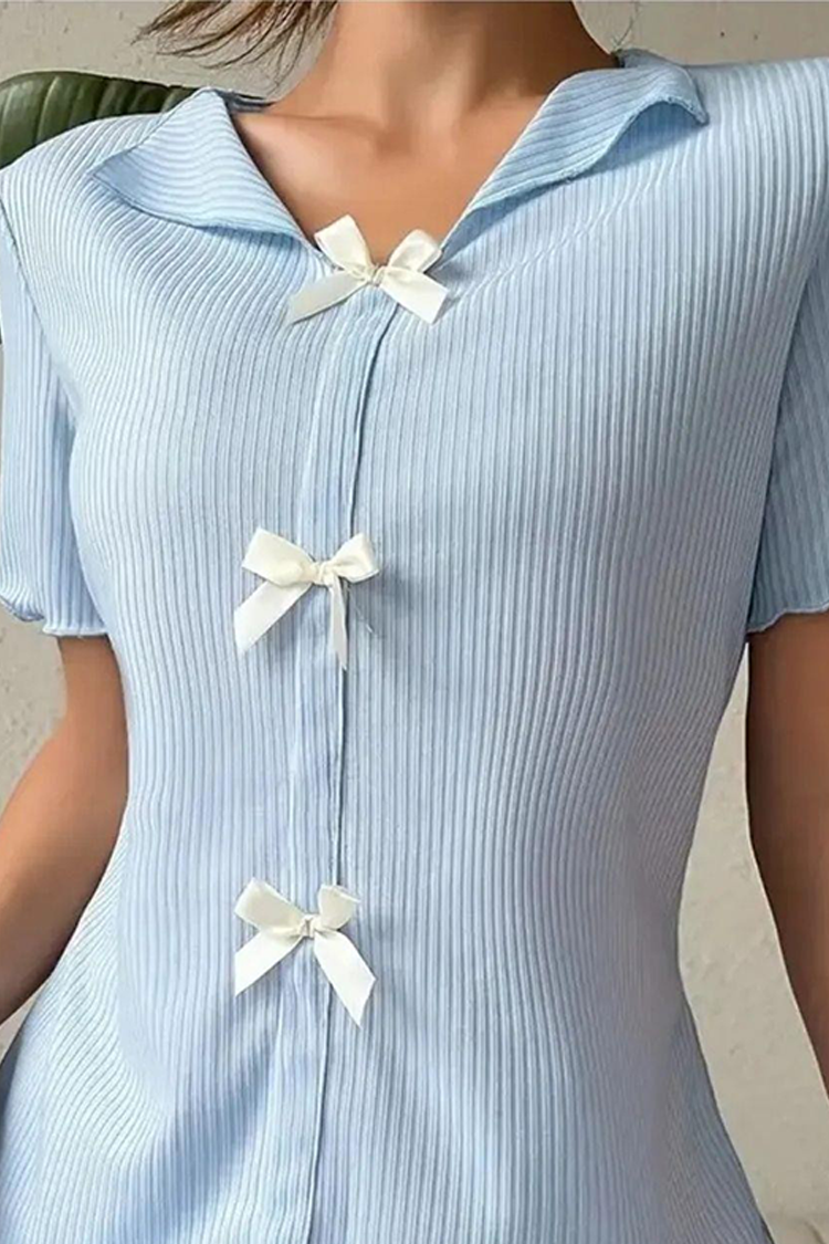 - Bluza are mâneci scurte, guler și panglici, iar pantalonii scurți sunt cu talie înaltă și confortabili.