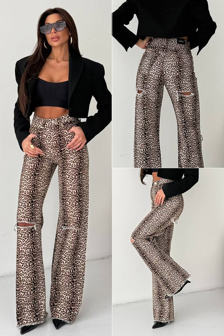 - Modelul are picioare largi, talie înaltă, croială lejeră, efect rupturi și animal print.