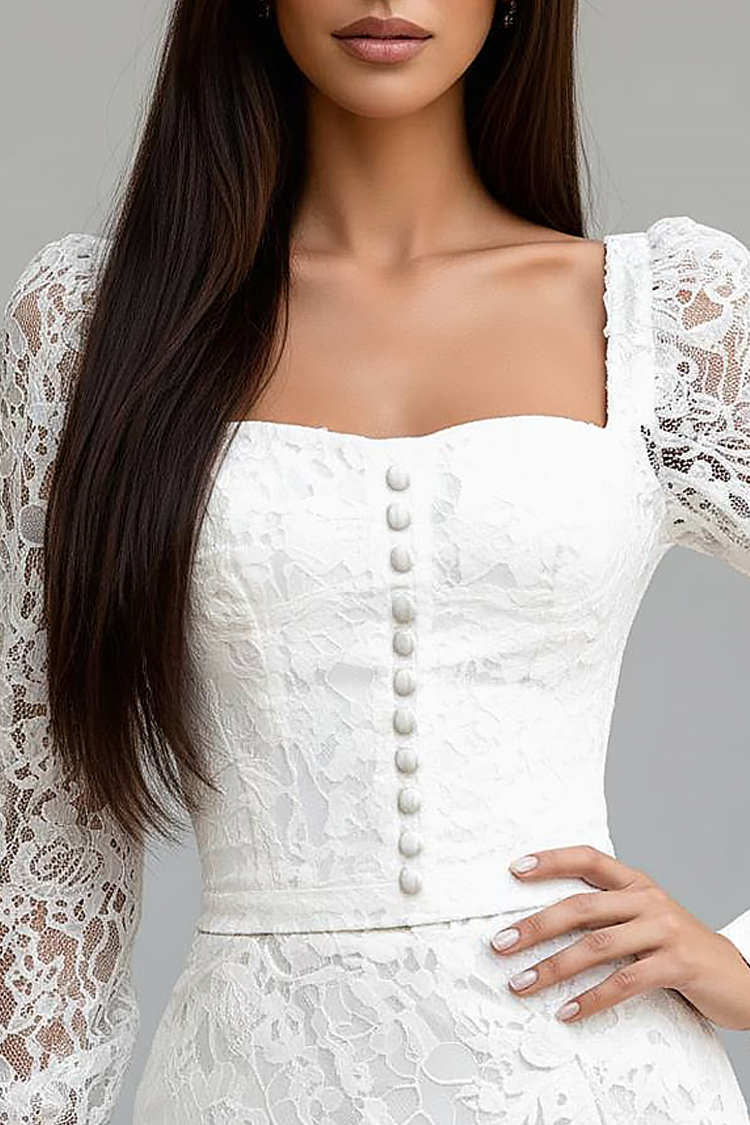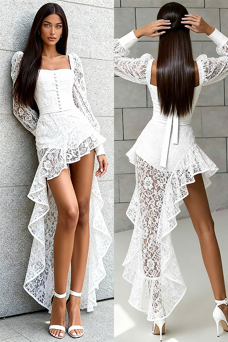 - Modelul are o croială mulată, design asimetric, dantelă sexy, mâneci lungi și nasturi.