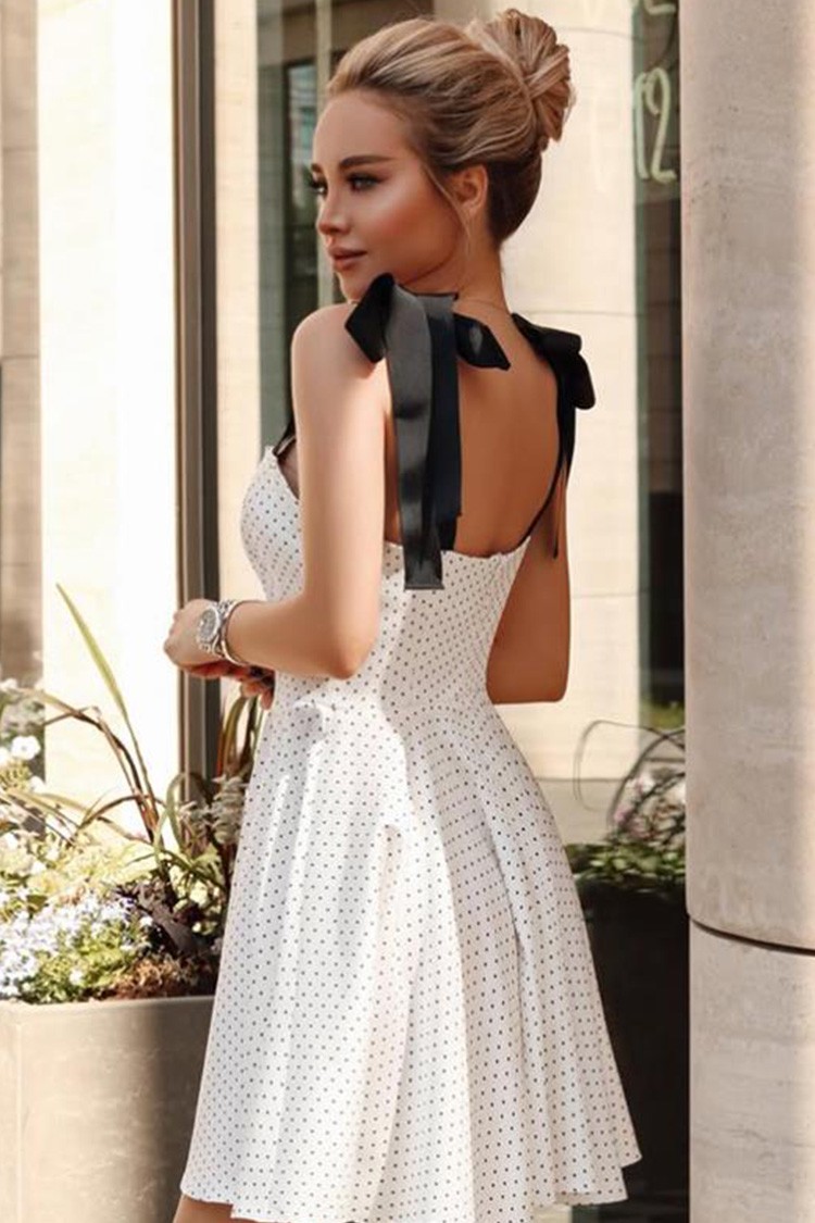 - Rochia are o lungime scurtă, model cu buline, spectaculos, bretele negre și este de culoare albă.
