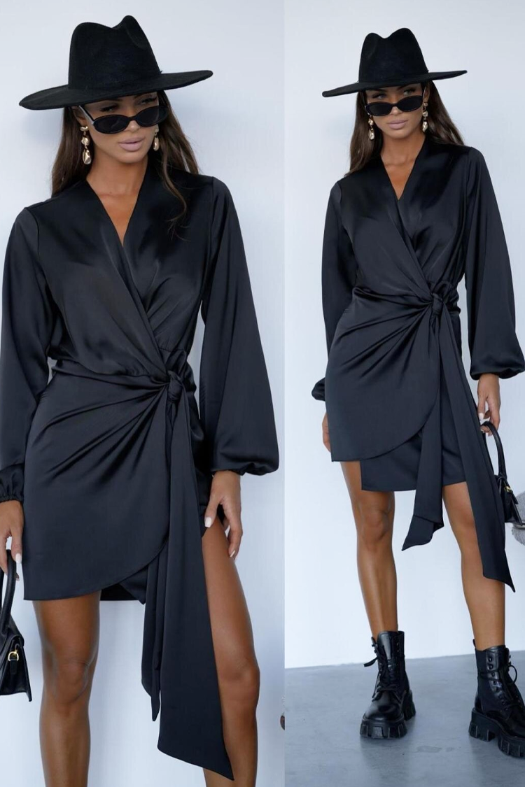 - Rochia are o croială asimetrică, culoare neagră, mâneci lungi și legături laterale.