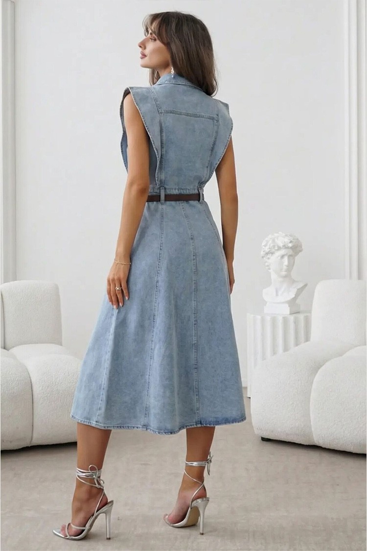 - Pentru un look delicat și la modă, alege această rochie din denim, perfectă pentru viața de zi cu zi.