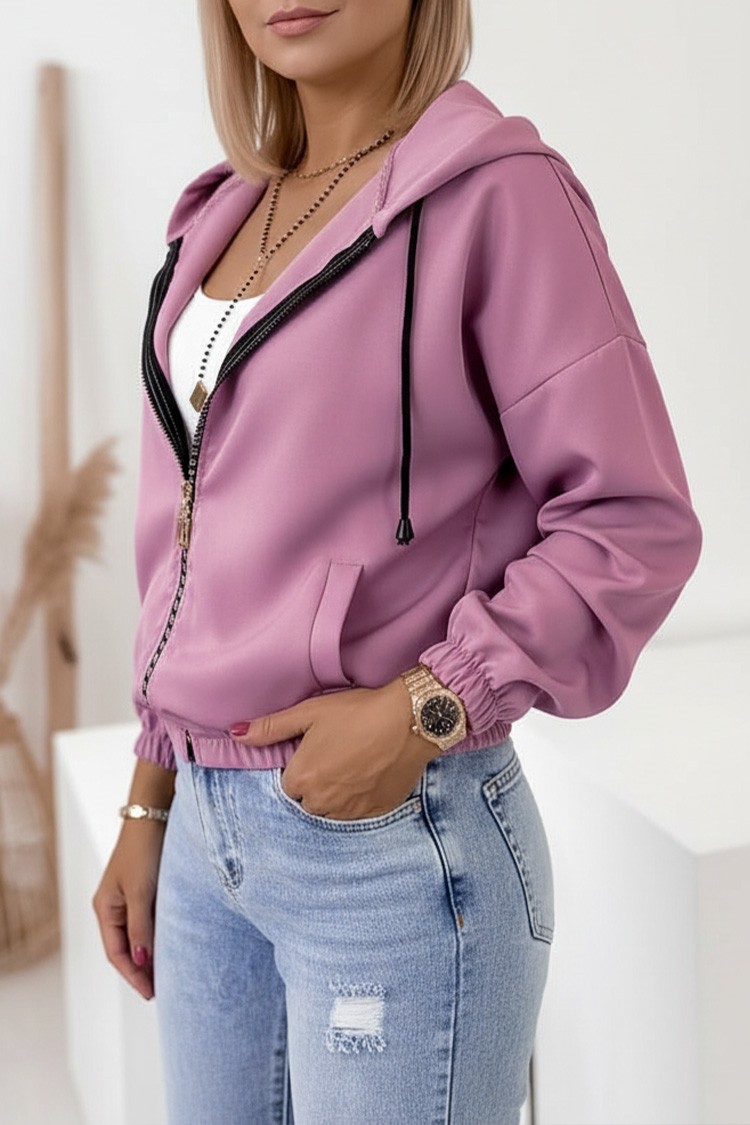 - Modelul are o croială clasică, buzunare laterale, glugă și se închide cu fermoar pe toată lungimea.