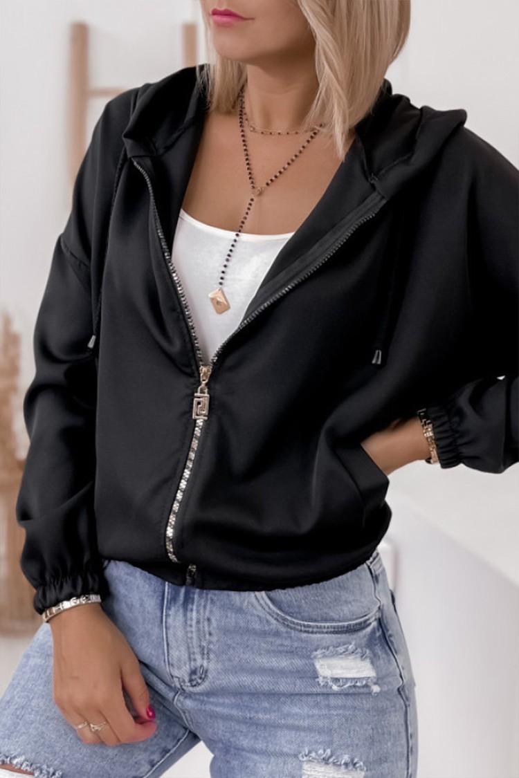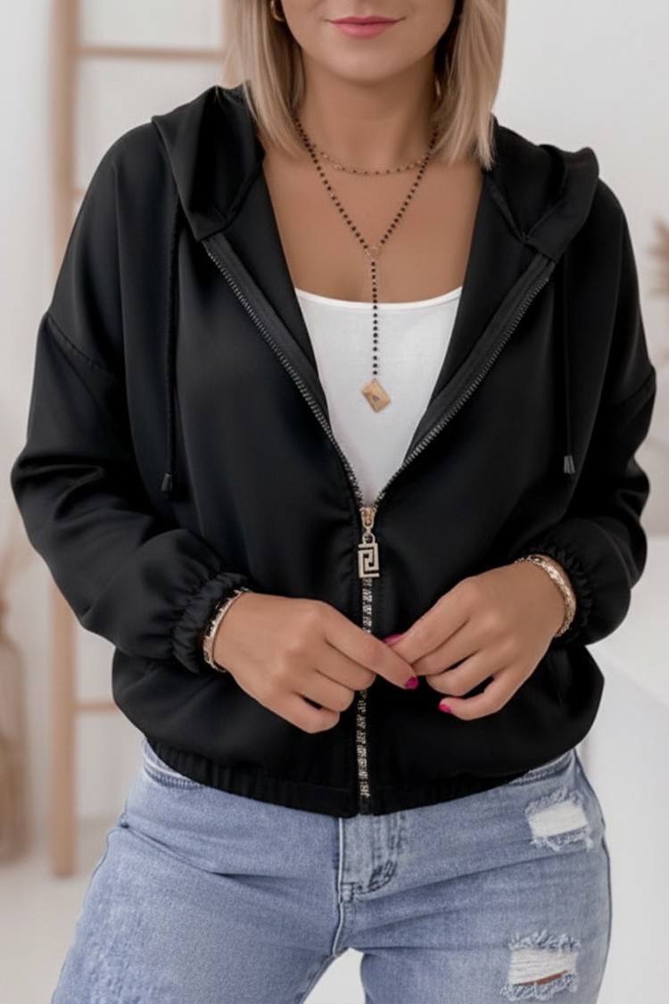 - Modelul are o croială clasică, buzunare laterale, glugă și se închide cu fermoar pe toată lungimea.