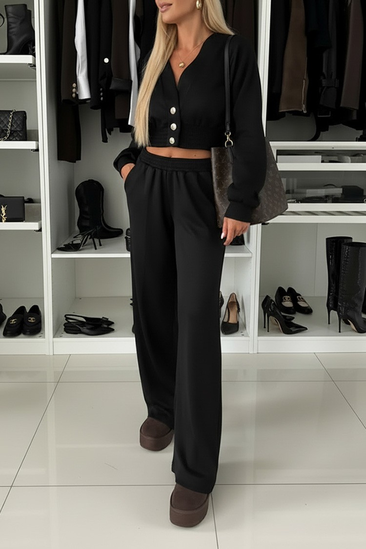 - Pantalonii au talia înaltă, elastică și picioare confortabile.