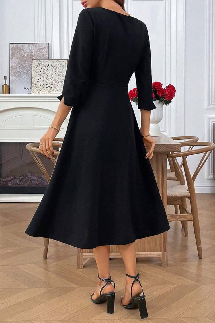 - Modelul are o croială evazată, design elegant, buzunare laterale și culoare neagră.