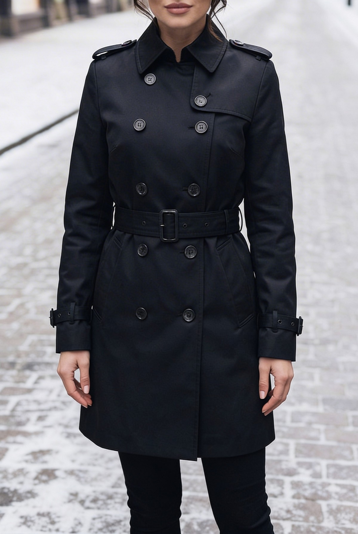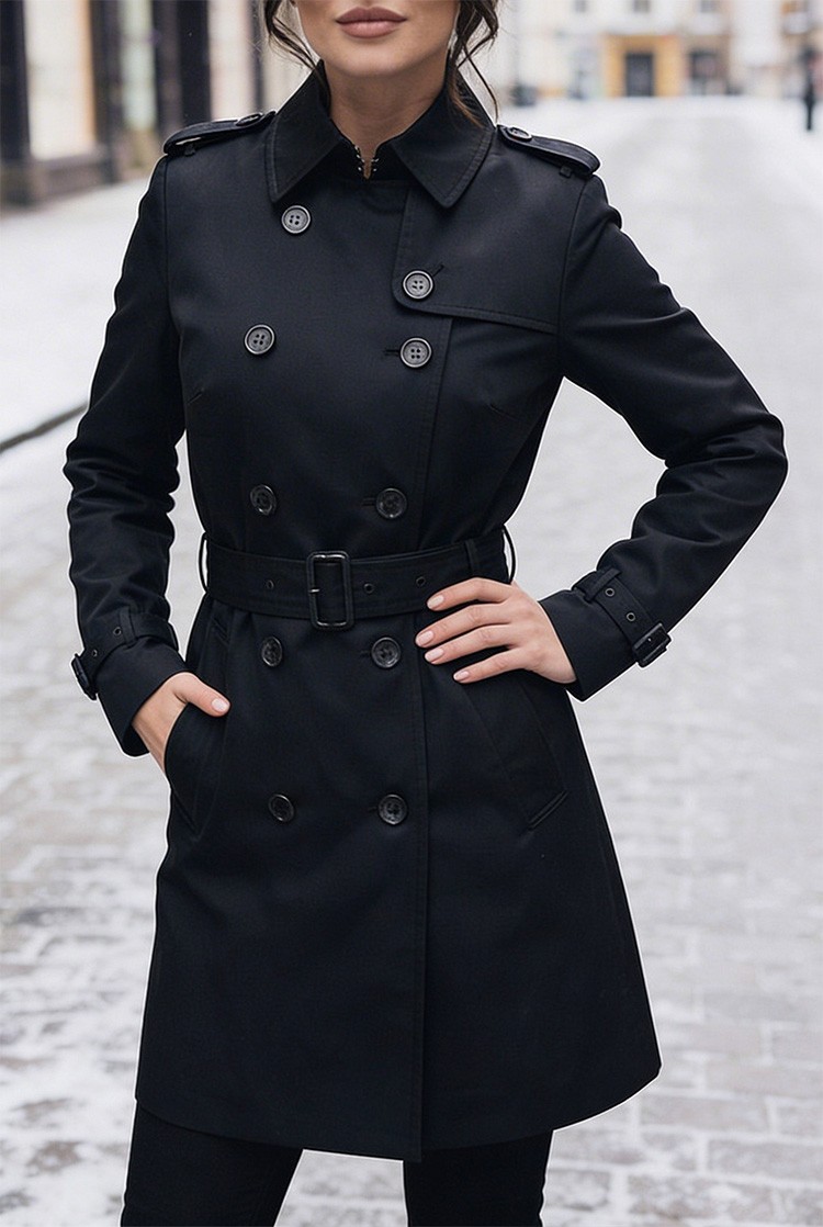 - Un trenci elegant, cu guler și curea, de culoarea neagră, pe care trebuie neapărat să-l ai în garderobă.