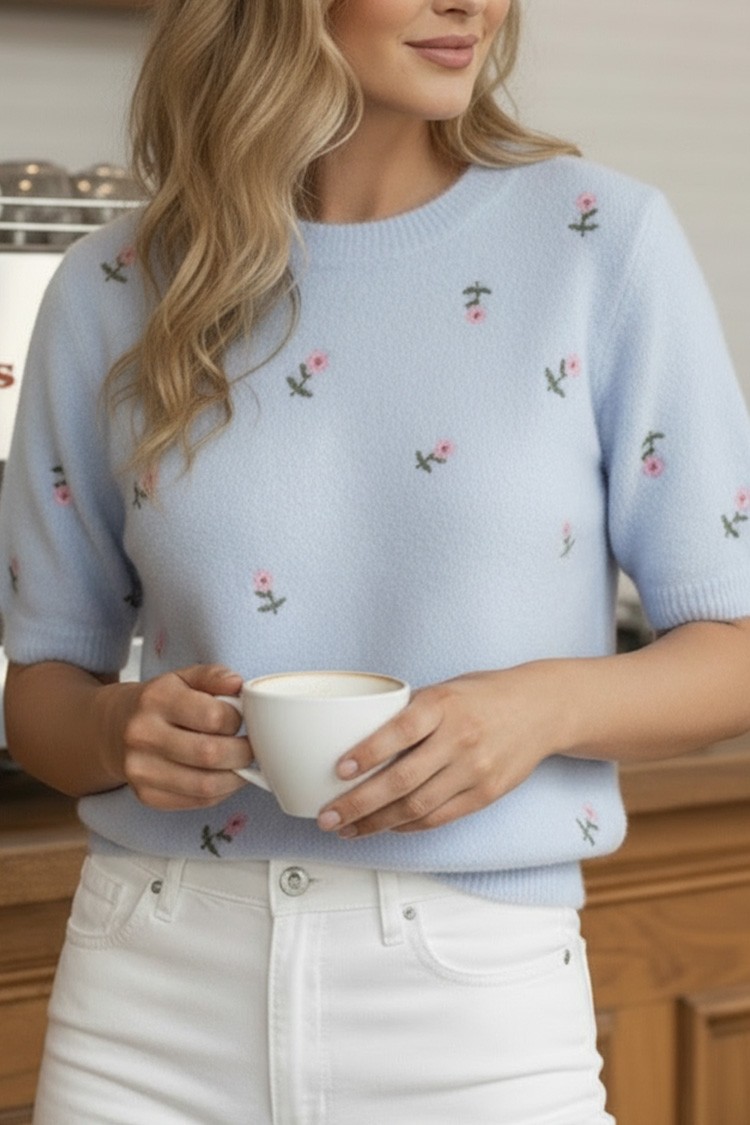 - Modelul are o croială confortabilă, mâneci scurte și un model floral.
