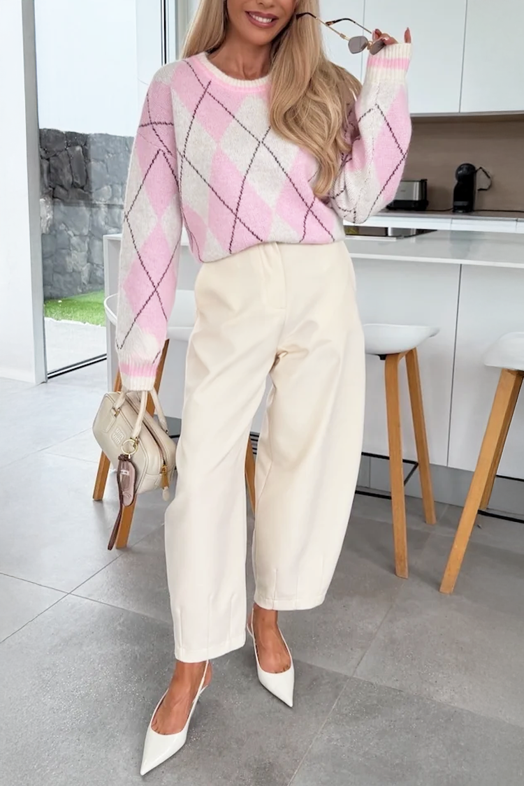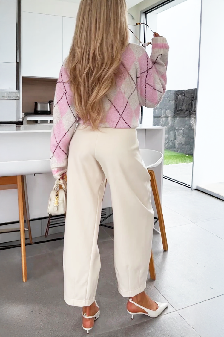 - Modelul are talie înaltă, croială modernă, buzunare și un model monocromatic.