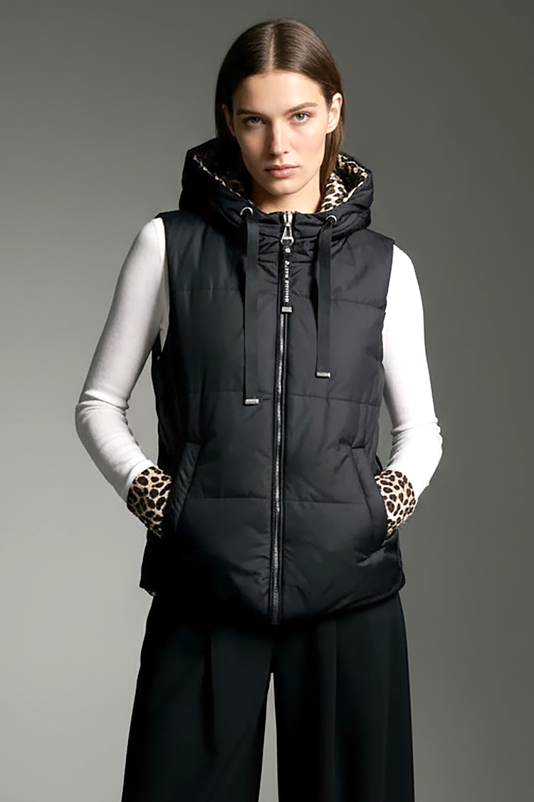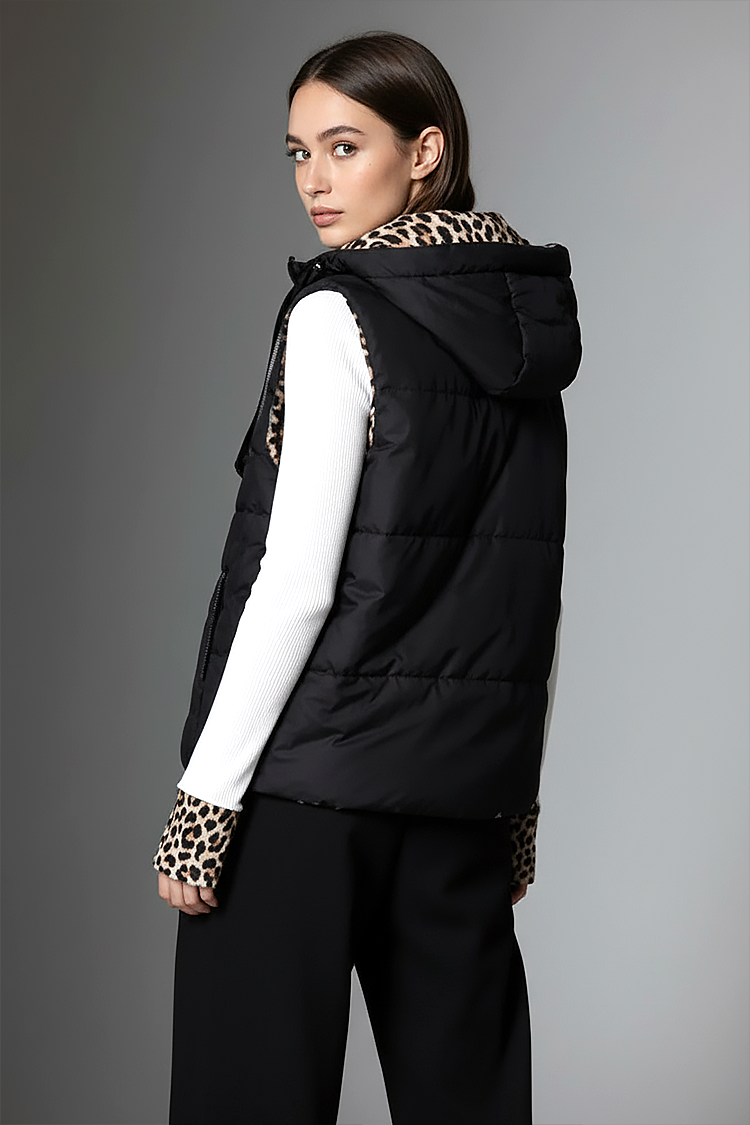 - Vesta are o croială clasică, glugă, fermoar pe toată lungimea și căptușeală cu animal print.