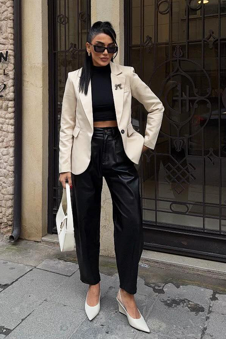 - O puteți combina cu un top, pantaloni drepți și tocuri înalte pentru un look complet și elegant.