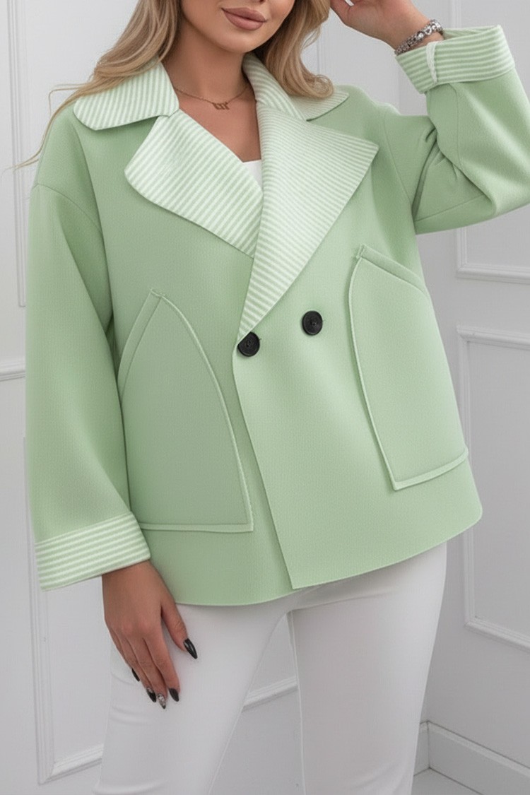 - Modelul are o lungime scurtă, buzunare laterale și nasturi în față.