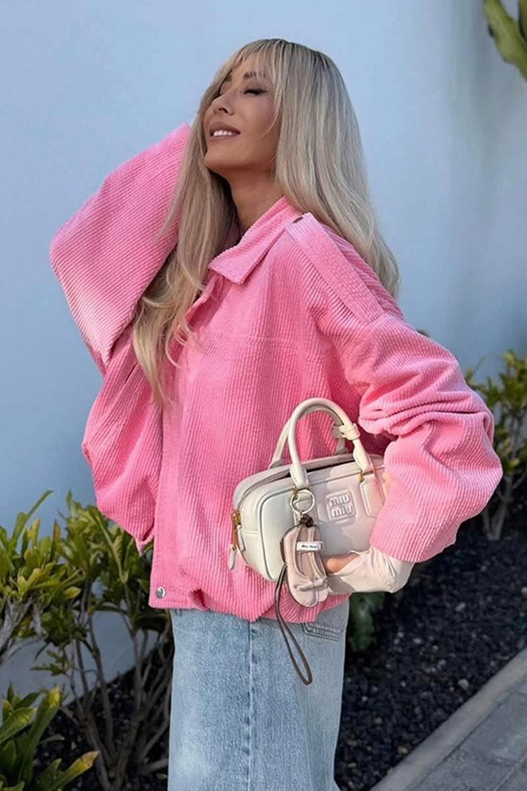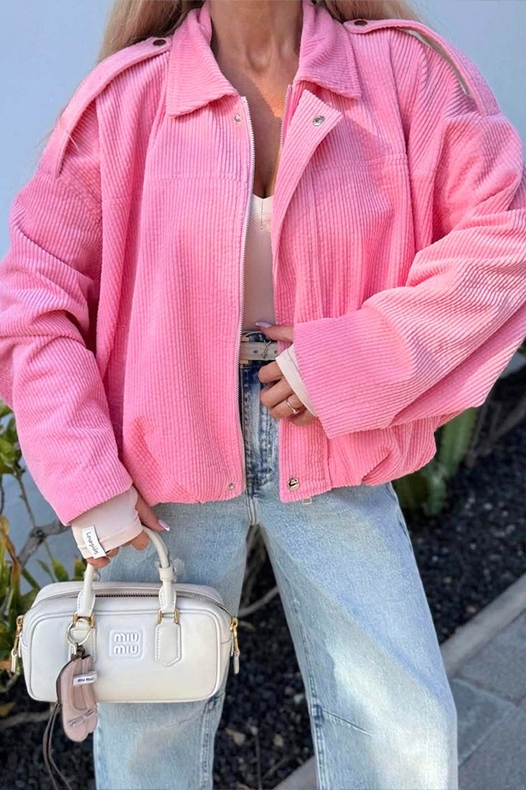 - Modelul are o croială oversize, design cochet, culoare roz și se închide cu fermoar și nasturi.