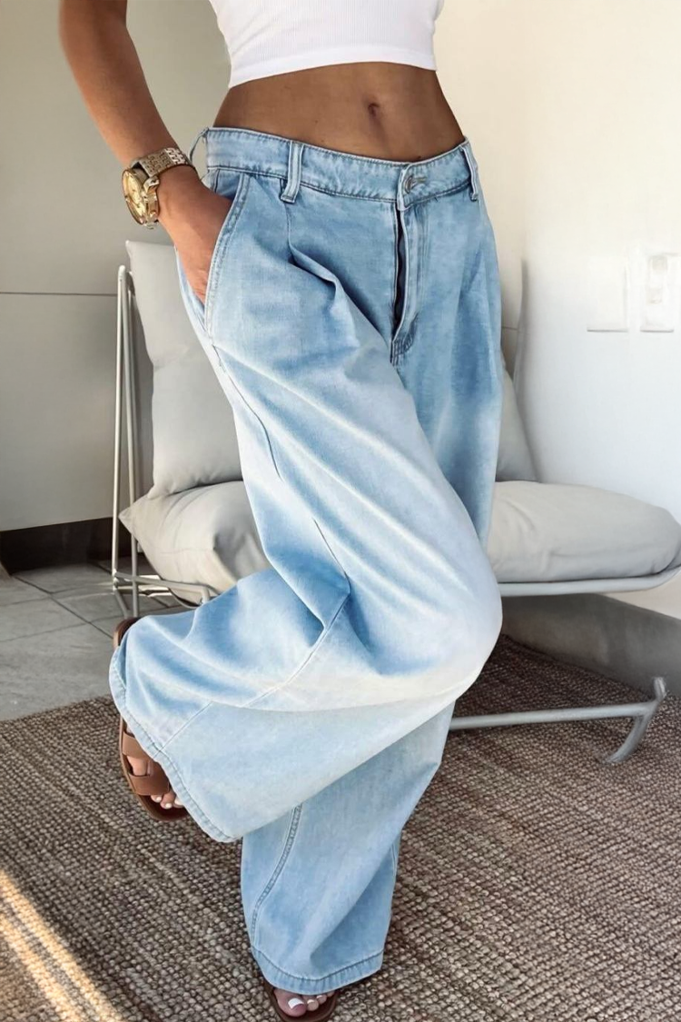 - Modelul are talie joasă, o croială lejeră și buzunare practice.