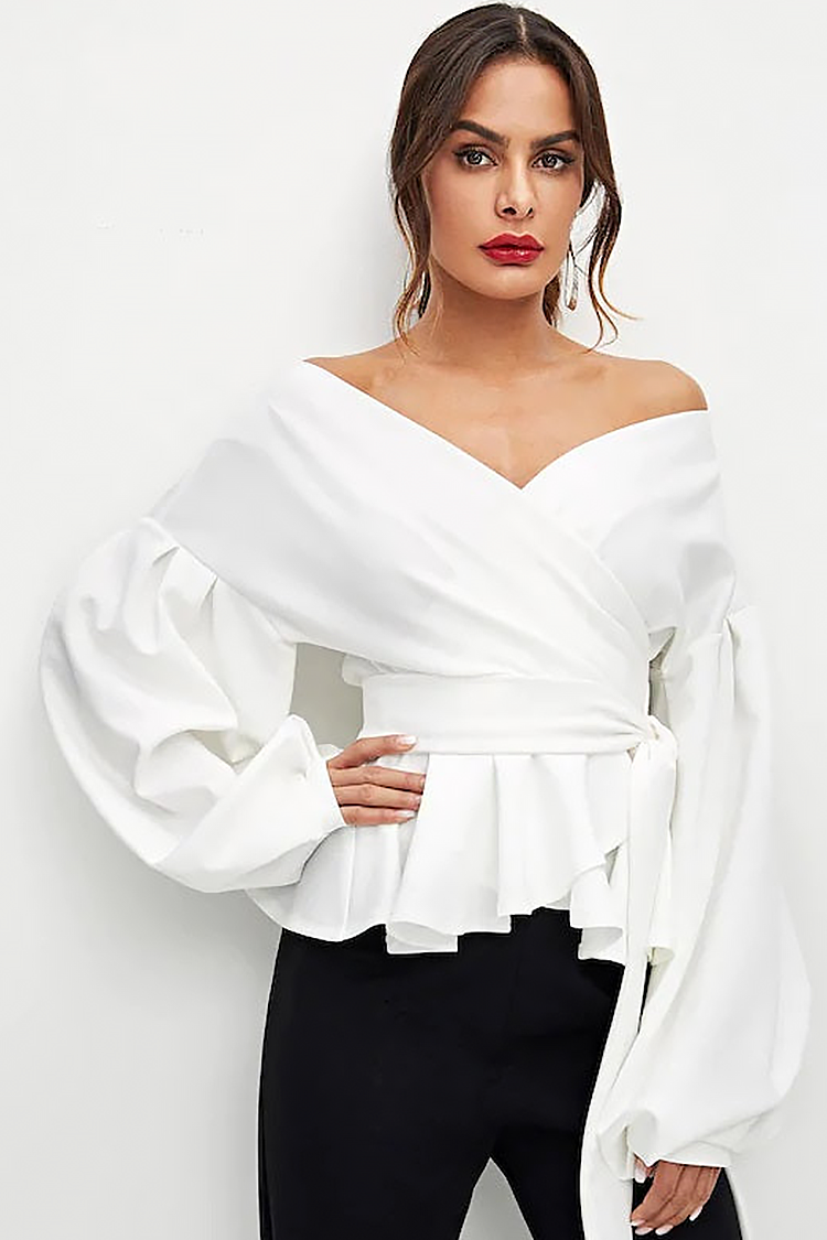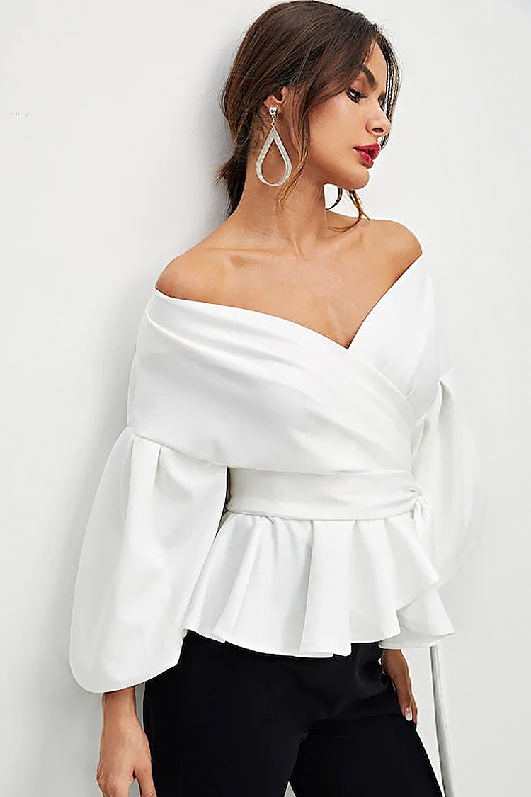 - Modelul are mâneci lungi, un design seducător, o curea impresionantă și umeri decupați.