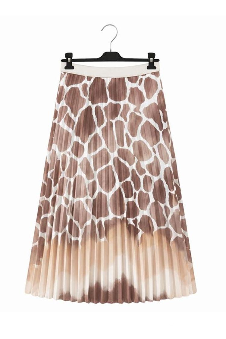 - Modelul are talie înaltă, material plisat și un model animal print atractiv.