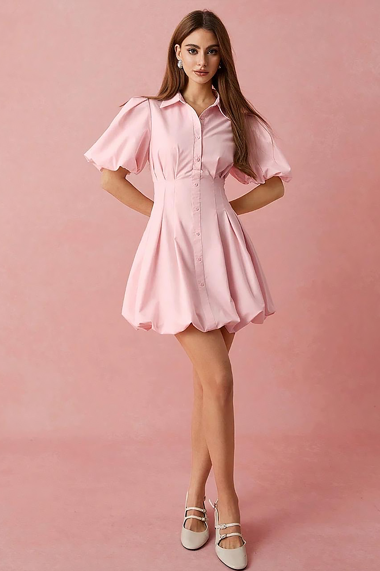 - Modelul are o lungime scurtă, nasturi în față, culoare roz și mâneci bufante.