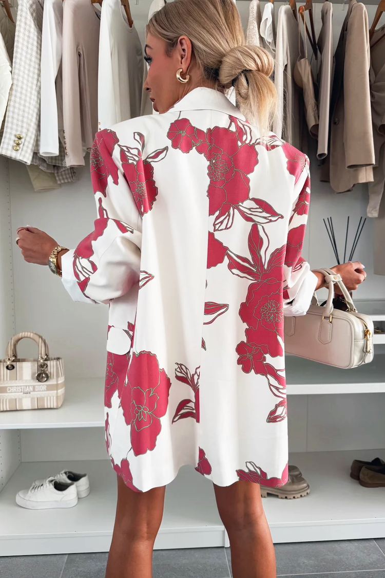 - Modelul are guler clasic cu rever și croială lejeră.