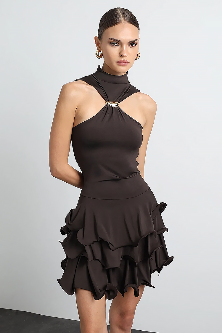 - Modelul are o lungime scurtă, design sexy, volane și partea de sus asimetrica cu detaliu metalic.