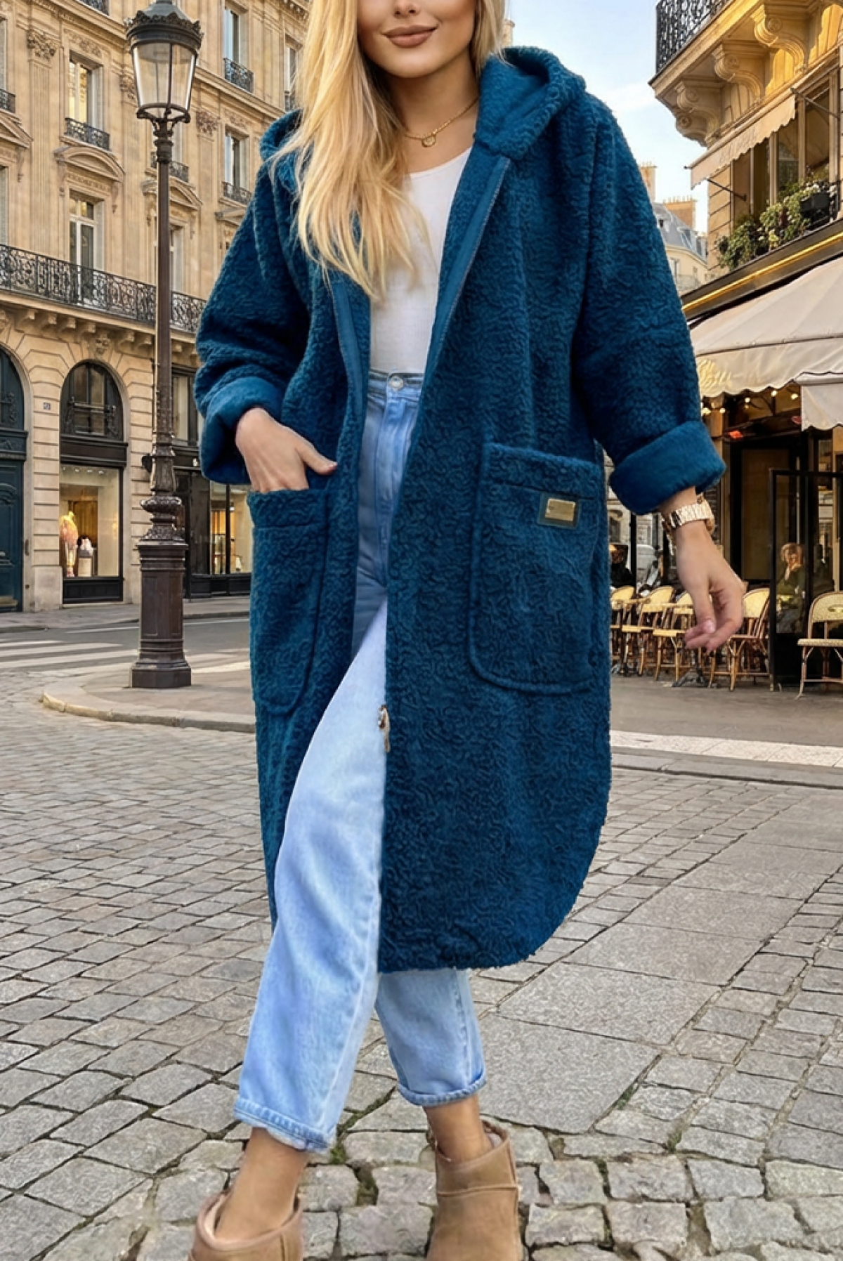 - Modelul este într-o culoare la modă, are o croială lejeră, buzunare și glugă.