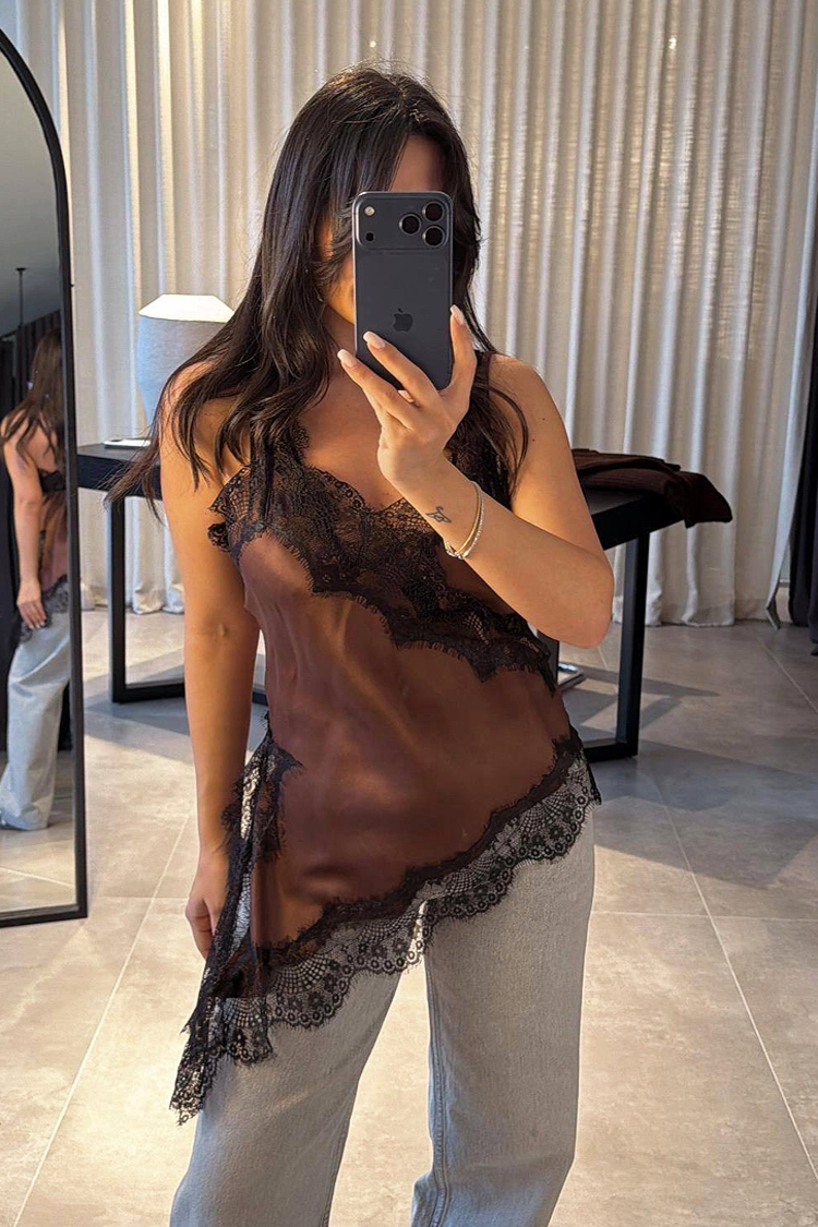 - Modelul are un design sexy, dantelă neagră, croială asimetrică de culoare maro.