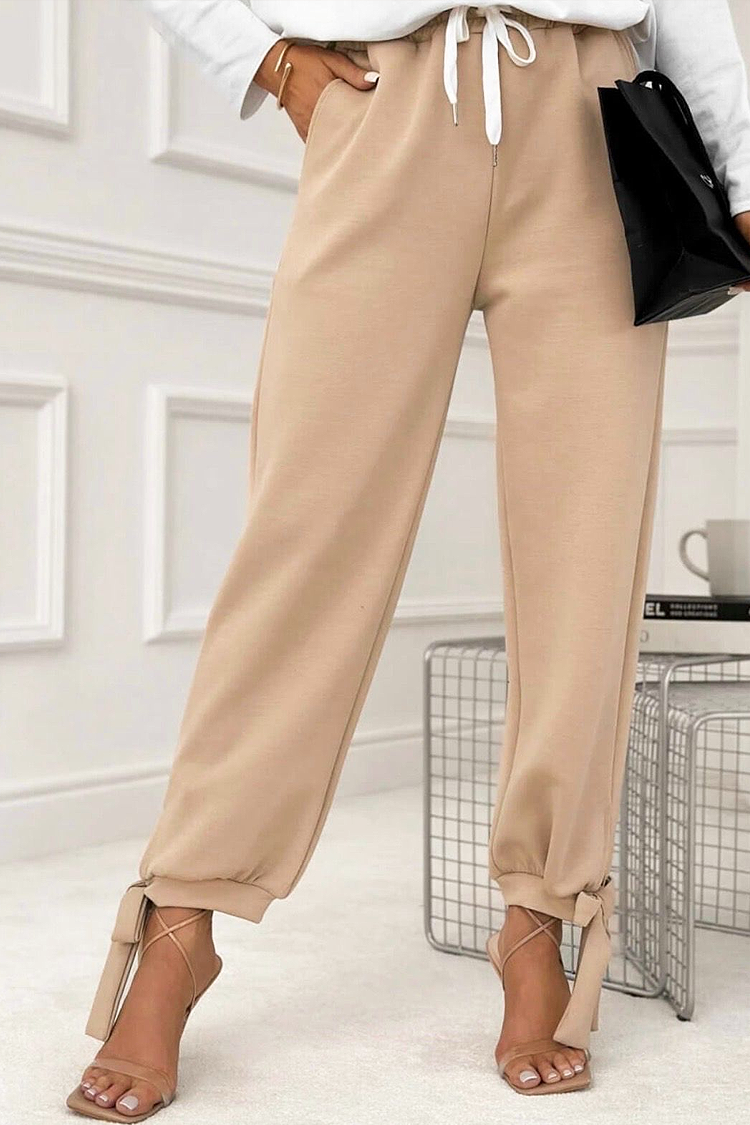 - Modelul are talie înaltă, o croială lejeră și legături spectaculoase la capătul picioarelor.
