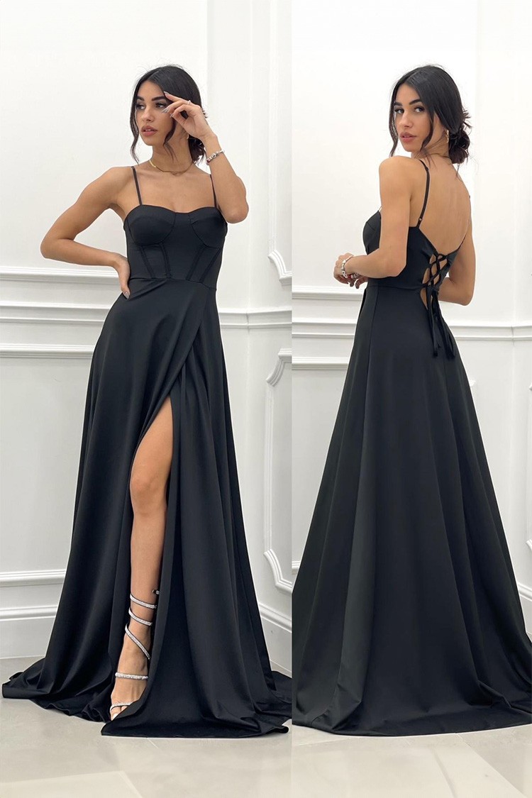 - Modelul are o croială clasică, culoare neagră, bretele subțiri și un spate spectaculos.