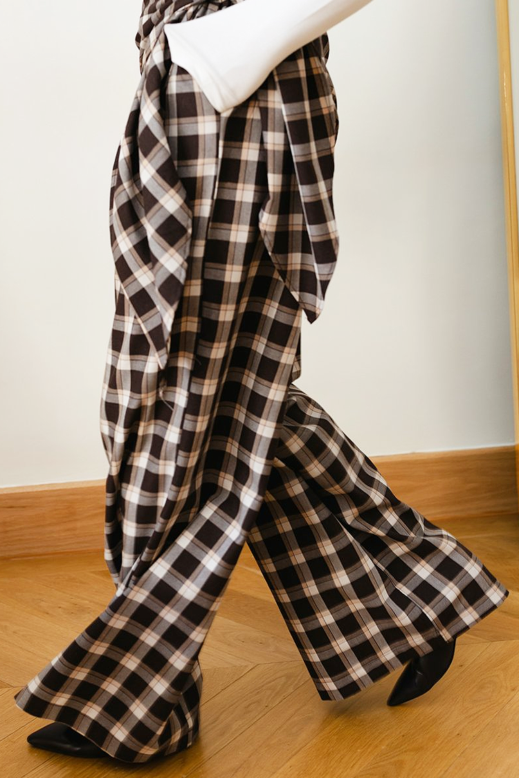- Modelul are talie înaltă, croială lejeră, model în carouri și un model în talie.